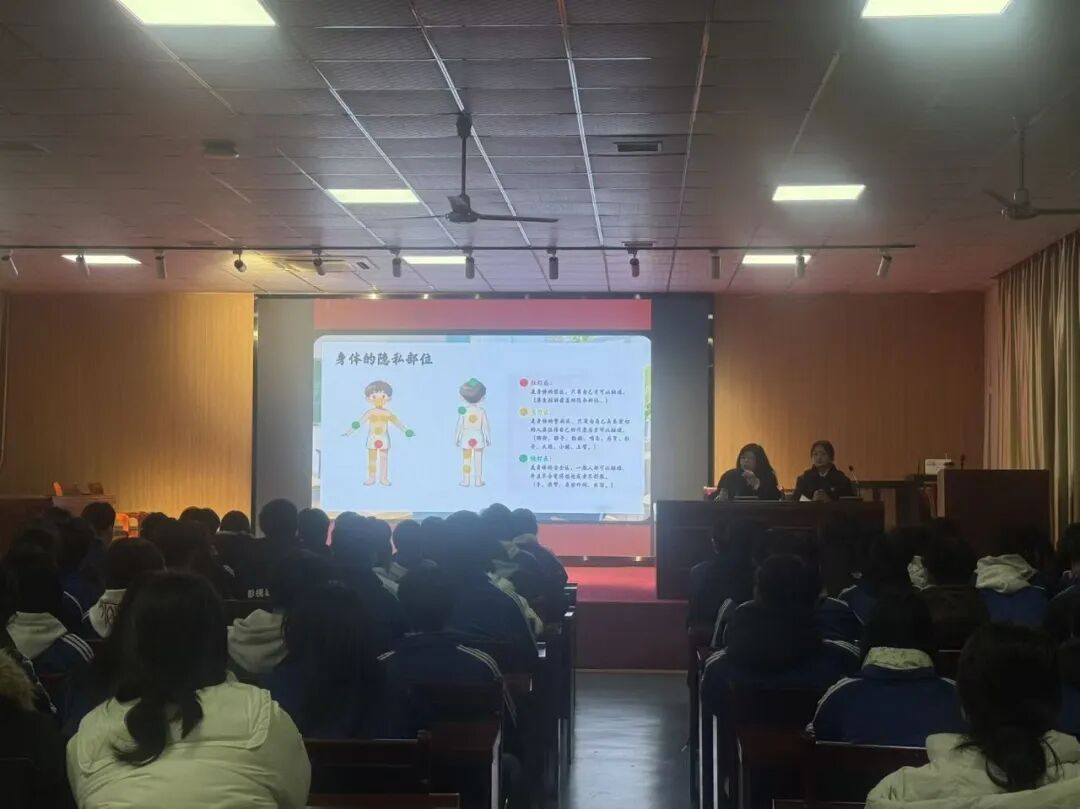 讲座中,郭佳法官围绕 "我们的身体不容侵犯" 这一核心主题,从同学们的生活实际出发,用通俗易懂的语言解读了性侵犯的多种形式。通过 "红灯区、黄灯区、绿灯区" 的形象划分,清晰界定了身体隐私部位的边界 —— 红灯区为绝对禁区,仅自己可触碰;黄灯区需经亲密关系者同意方可触碰;绿灯区为一般社交可接触范围,让同学们直观掌握了身体主权的边界划分。同时,郭佳法官明确指出,无论是他人不必要的隐私部位触碰、公共场所的恶意搂摸,还是强迫观看色情影像、言语性挑逗等行为,都属于侵权甚至违法犯罪行为,无论实施者是陌生人、熟人还是亲属,都应坚决抵制。