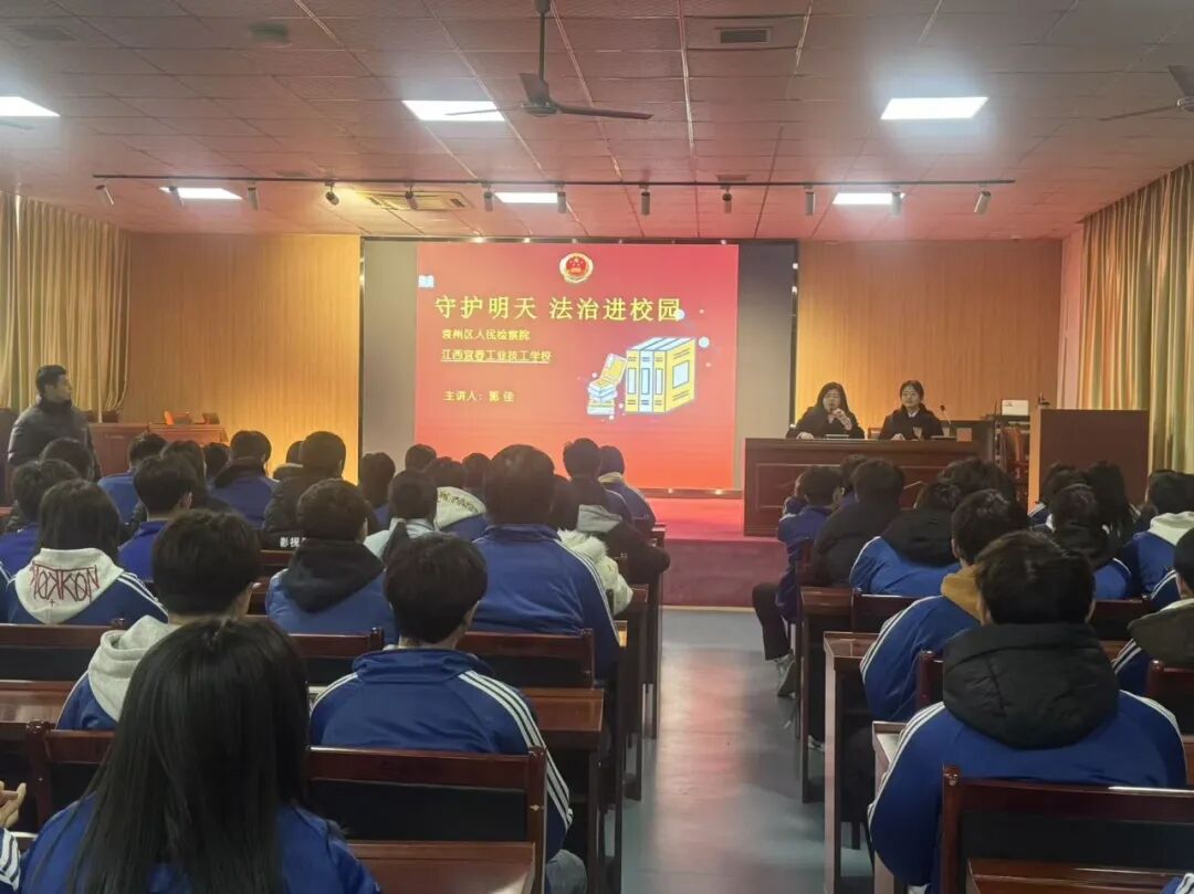 为切实加强未成年人法治教育,提升同学们的自我保护意识和防范能力,12月22日,袁州区人民检察院的郭佳法官走进江西宜春工业技工学校,开展了以 "守护明天 法治进校园" 为主题的专项讲座。本次讲座聚焦未成年人权益保护核心,用生动案例、实用知识为同学们送上了一堂干货满满的法治 "安全课"。